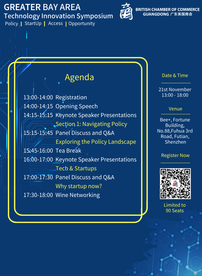 Upcoming Shenzhen GBA Symposium 本届深圳大湾区研讨会 21st November 11月21日 Following on from the British Chamber of Commerce Guangdong's June GBA Symposium in Guangzhou, we turn our attention to Tech & Innovation industry in Shenzhen, where there is a growing focus from investors, governments and technologists themselves. We aim to find out why, and how to support this sector. Join to hear speakers share their views on: 继6月在广州举行的广东英国商会大湾区研讨会之后,我们将焦点转向深圳科技创新产业。投资者,政府和专业人才也在持续关注深圳科技创新行业的发展。本次研讨会旨在阐述为什么以及如何支持该行业,本次研讨会演讲者也将阐述以下方面: